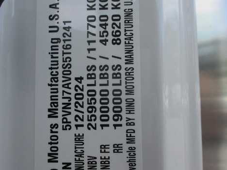 2025 HINO, L6. 25,950 GVWR. WITH A MORGAN 26' BOX INSTALLED. NO WAIT TIME FOR A BOX ! IN INVENTORY NOW !! CUMMINS. 6.7 LITER RATED AT 260 HP TRANSM. ALLISON. 2500RDS WHEELBASE. 271" AIRRIDE REAR SUSPENSION 5.57 GEAR RATIO CARGO BOX INFORMATION: MORGAN ALUMINUM ROOF, PLYWOOD REINFORCED STEEL SCUFFLINER, FRONT AND SIDES THRESEHOLD PLATE INSTALLED 2 ROWS OF E-TRACK DHOLLANDIA LIFTGATE INSTALLED. TUCKAWAY. 3,300LBS.